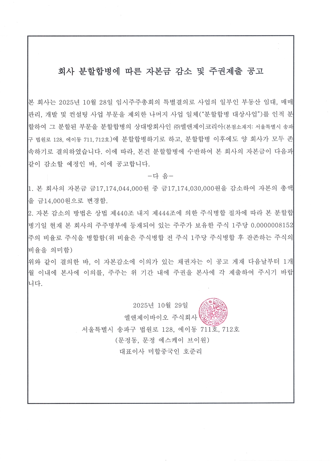 Notice of Capital Reduction and Submission of Share Certificates Pursuant to the Spin-off and Merger